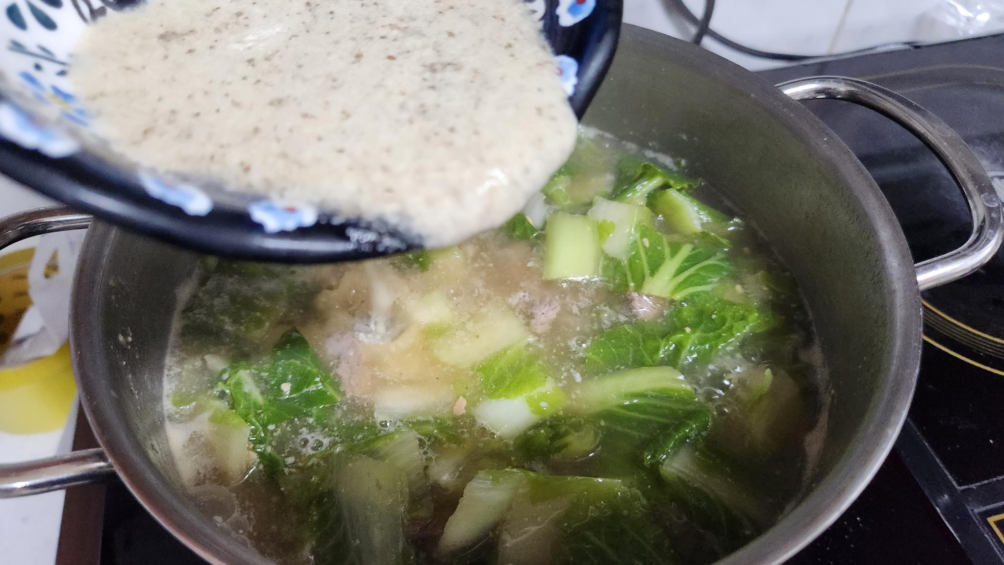 준비물 : 데친 배추. 국거리소고기. 다진마늘1큰술. 쌀뜨물. 참치액1큰술. 굵은소금반숟갈. 들깨가루3큰술. 된장1큰술.