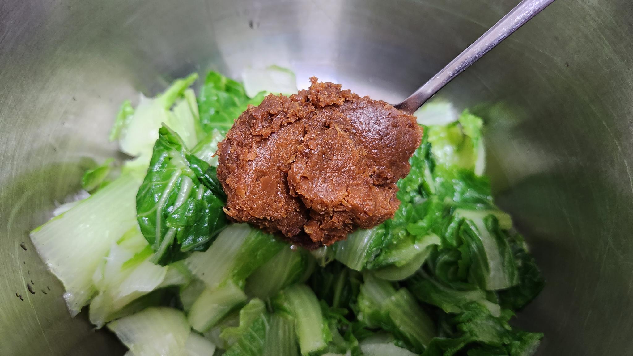 썰어서 준비한 배추는 된장1큰술. 다진마늘1큰술 넣고 버무려서 준비합니다